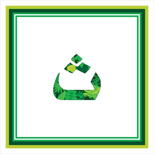 صورة تتضمن الحرف العربي "ف" بتصميم نباتي أخضر يبرز نماذج أوراق نباتية متنوعة. ال ...