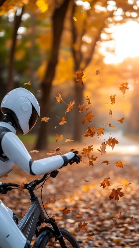 A robot riding a bicycle in an autumn forest, with yellow and orange leaves fall ...